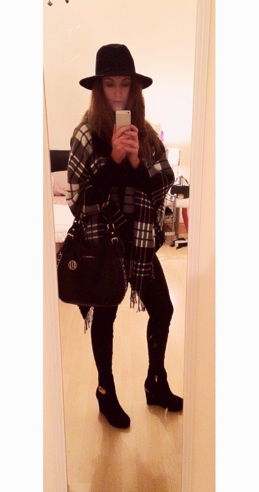 The monochrome cape with the faux fur collar I am wearing is from River Island they have sold out but you can get it in grey check which I think would be perfect with jeans and a pair of boots.