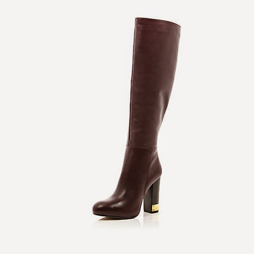 The boots can be bought here >>> http://eu.riverisland.com/women/shoes--boots/calf--knee-high-boots/Red-leather-knee-high-gold-heel-boots-663943
