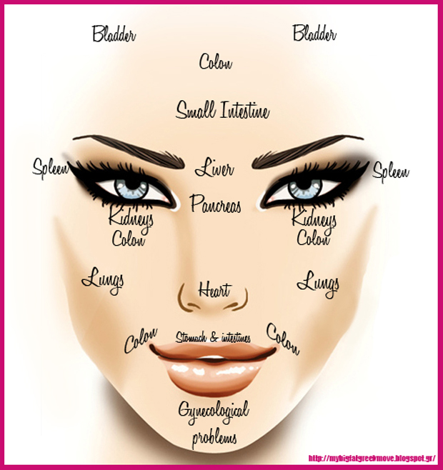 I find it fascinating that each area of your face is linked to a particular organ of the body, think of it like face reflexology. I have started to look very closely at my skin to find out if I can get to the root of the problem. According to Chinese Medicine up to 70% of aliments and disease can be picked up be reading the face. Certain symptoms which show up on your face can indicate what is happening on the inside, such as breakouts, discoloration and texture. These should be viewed as warning signs to improve your health, sleeping patterns or lifestyle.